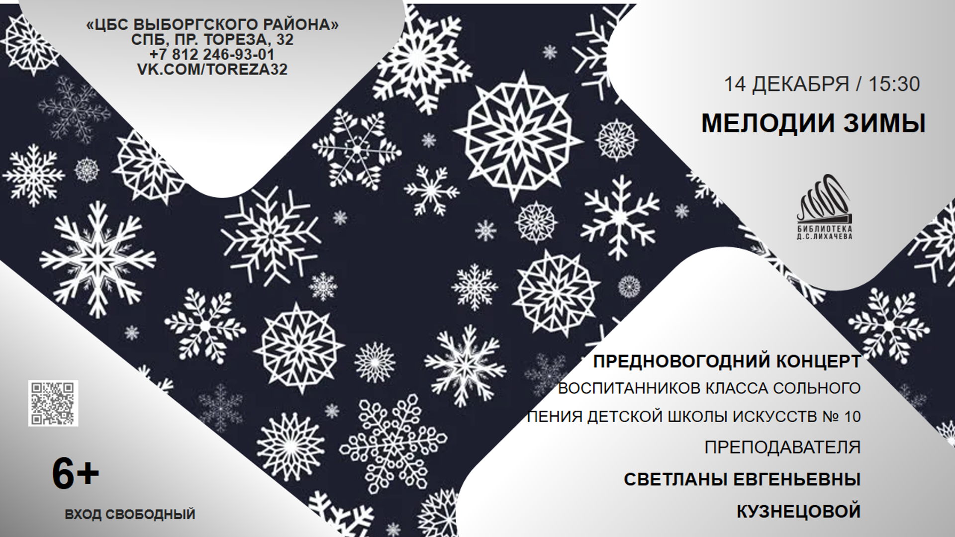 Библиотека имени Д.С. Лихачёва приглашает ценителей классической музыки на предновогодний концерт «Мелодии зимы». В уютной атмосфере библиотеки выступят юные таланты — воспитанники класса сольного пения Детской школы искусств № 10.